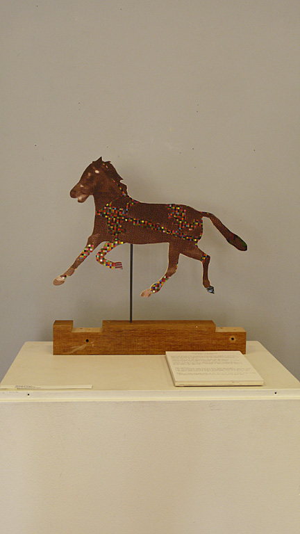 contents: -“Occident” trotting right to left , by E. Muybridge, c.1877 - Outline and pixels drawn from “Occident” image reproduced in “Time Stands Still,” exhibit catalogue, Cantor Museum, 2003. - Sky and live oaks over the stables at Stanford; steps for mounting a horse - jpeg images taken with Leica D-Lux 3 on 10/16/08. - Composite image printed on Epson Enhanced Matte paper with archival inks. Mount: - Birch plywood from Home Depot in East Palo Alto, sawed to shape by Max Citron at Stanford’s product realization lab. - Old-growth fir work table leg - recycled from Stanford wood shop, cut to specs at Stanford's sculpture lab. |